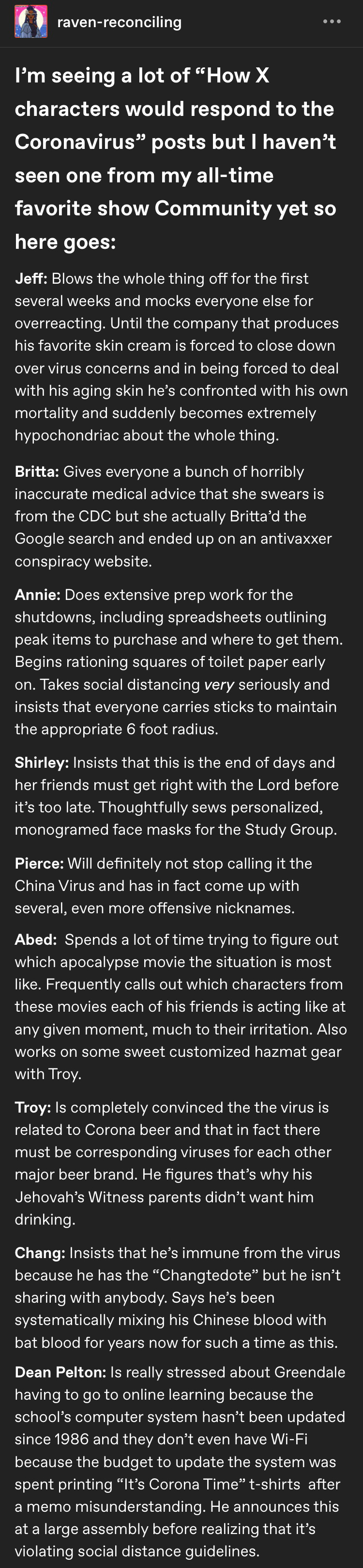 How the cast of Community would react to C-19, probably.